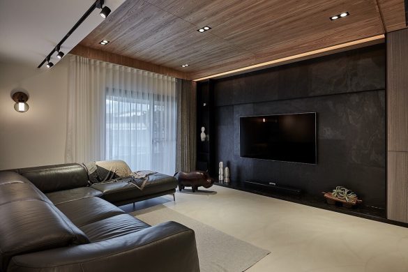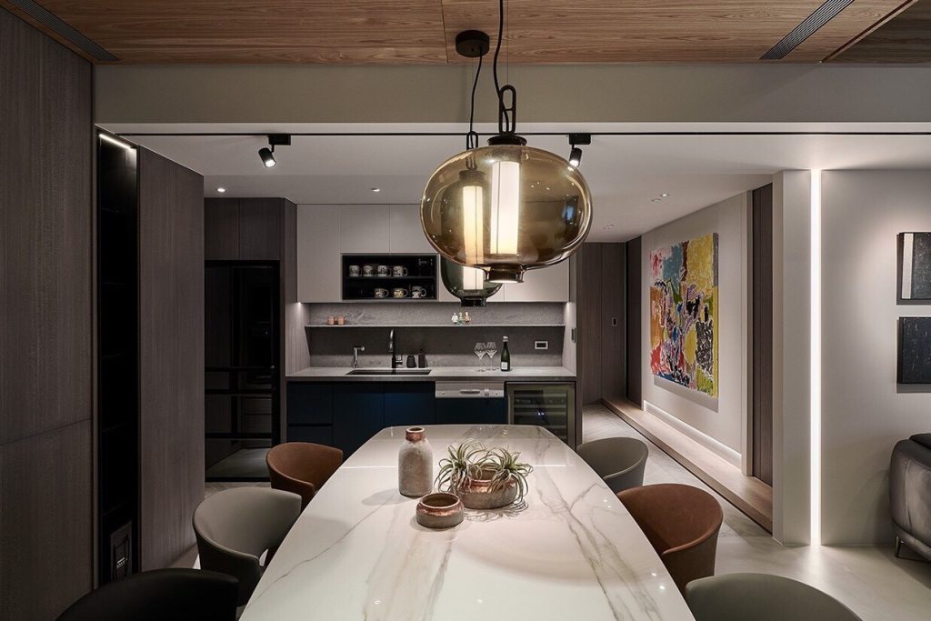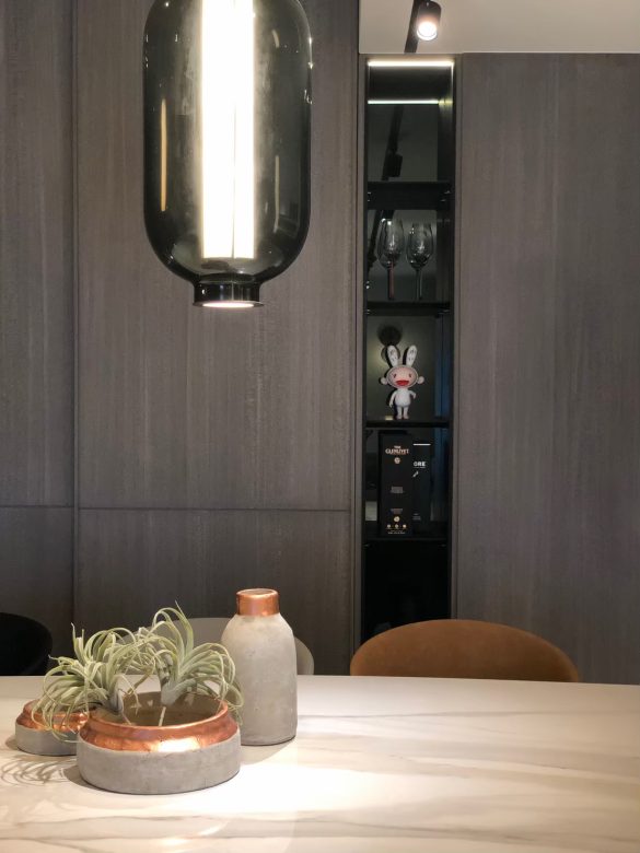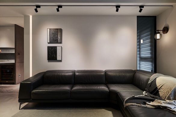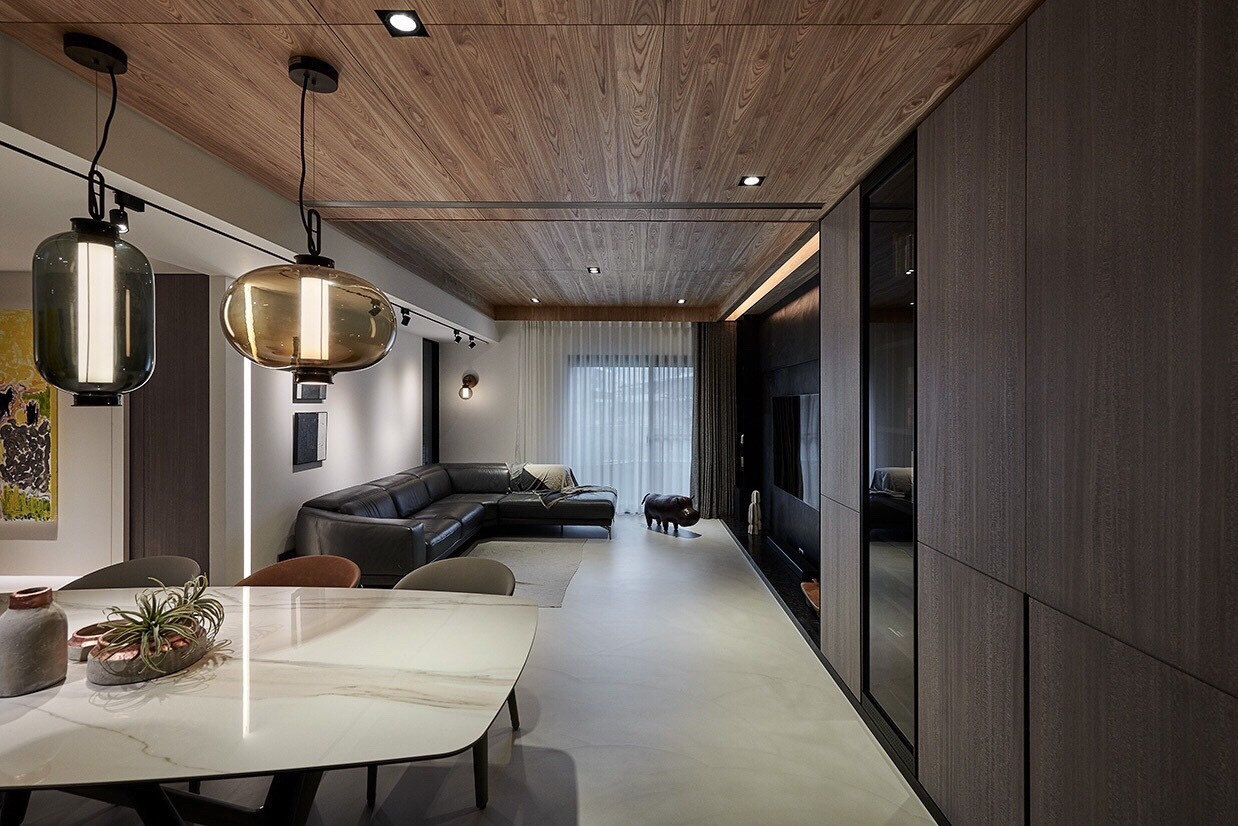 An abstract totem of non-representational imagery, vibrant in its colorful tension, expresses emotions through a serene space. A painting co-created by the entire family links public and private domains, embodying a tight bond among family members. The foundational building materials of the space—wood, stone, iron elements, and cement—converse with each other, existing within a natural rhythm like a breath.