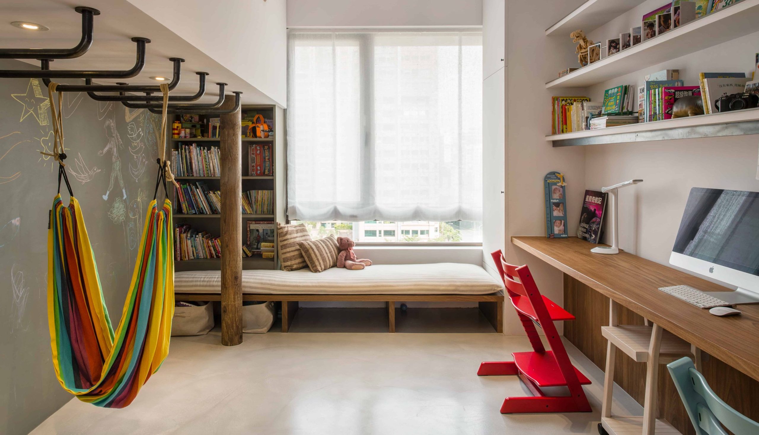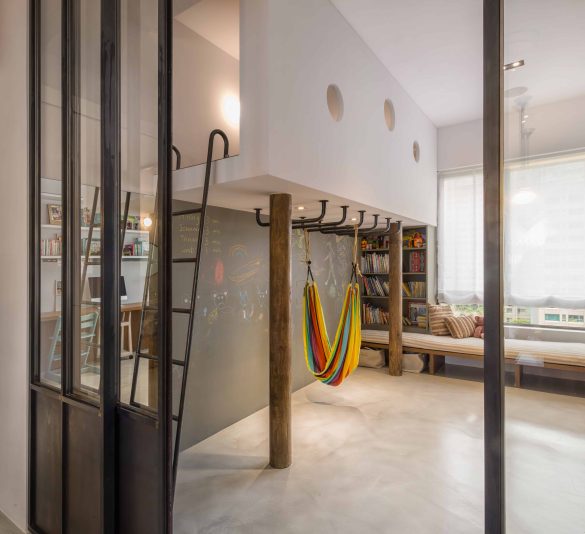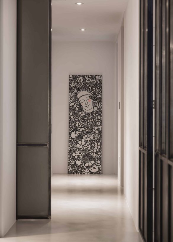The most genuine wrought iron, bearing the marks of polishing, serves as lines shaping the contours of space. Instead of smooth spray paint, the tactile quality of rolled paint prevails, creating a space full of childlike wonder, connecting at the heart of the home—the dining area—to evoke beautiful verses within the space.